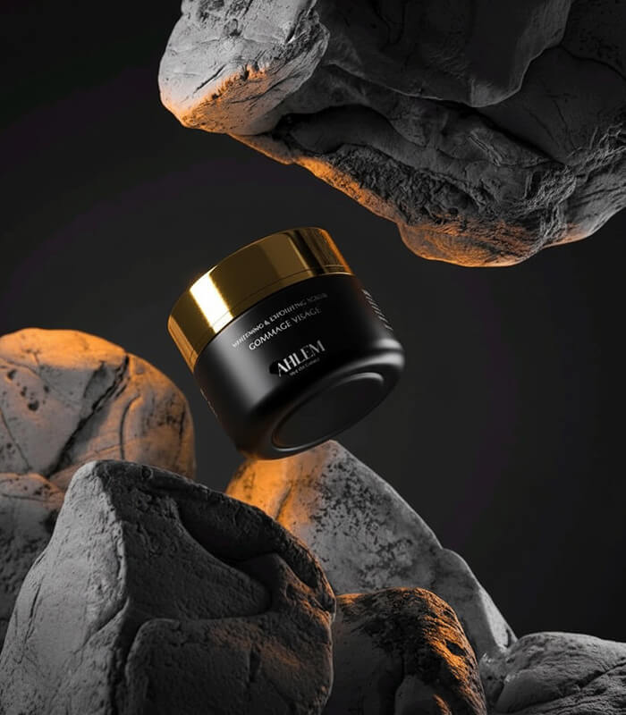 Plongez dans l’univers luxueux du Gommage Visage AHLEM, présenté dans un écrin noir mat rehaussé d’un couvercle doré raffiné. Mis en scène au cœur de roches minérales, ce soin exfoliant révèle toute sa puissance : une formule éclaircissante et lissante, pensée pour purifier la peau en profondeur, éliminer les impuretés et révéler un teint plus lumineux.